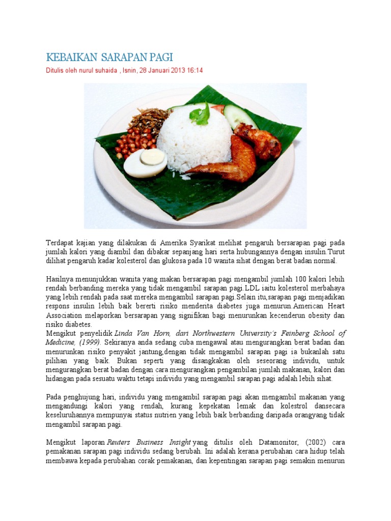 Kepentingan sarapan pagi Faedah-faedah Mengambil Sarapan Pagi. Pengambilannya satu kemestian yang tidak boleh dipandang mudah. Contoh Karangan Kepentingan Budaya dan Adat Resam.